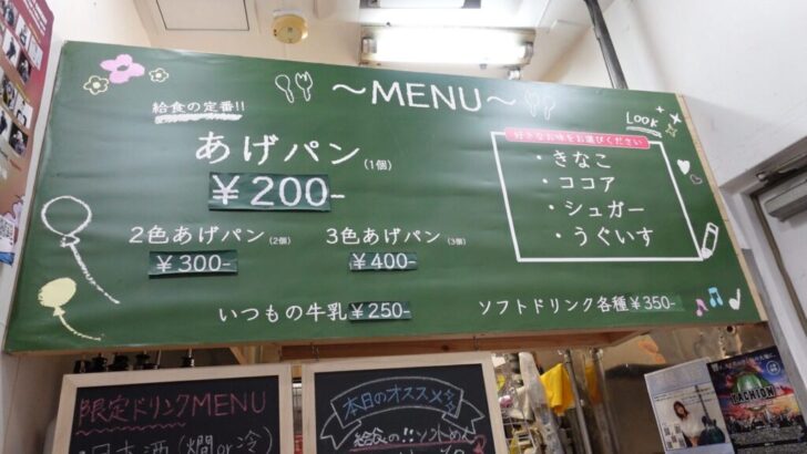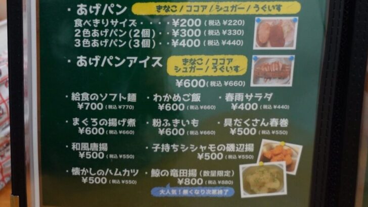 単品メニューには揚げパンだったり鯨の竜田揚げだったりラジバンダリ。