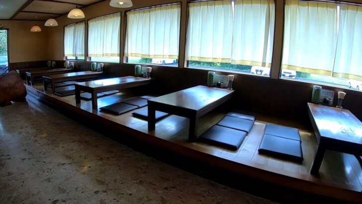 厨房の前にカウンター席、カウンター席後ろの小上がりにはずらりと並ぶテーブル席、入口正面にイスに座るタイプのテーブル席がありました。