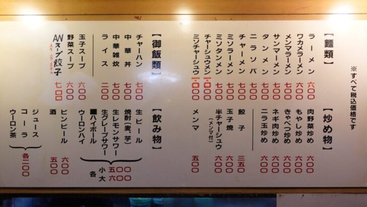 ラーメン各種を中心に町中華らしい炒め物の一品料理など、お安めなメニューが並びます。