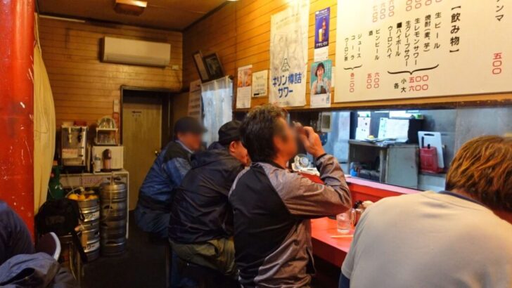カウンターには常連客と思われるおっさん達が楽しそうに酒を飲んでいます。昭和の風情あふれる雰囲気がたまらない店ですね。