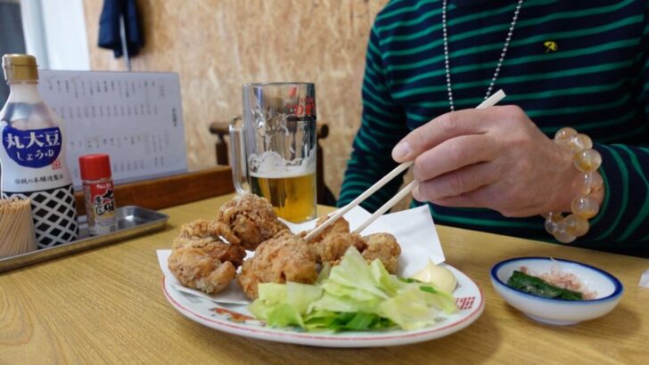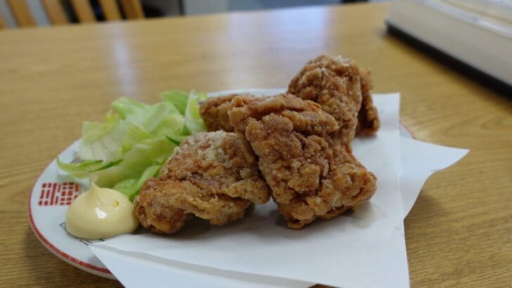 片栗粉多めで竜田揚げっぽく揚げられた鶏の唐揚げ、カリっとサクッと美味しい。
