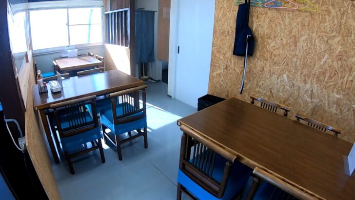 コンパネで壁が仕切られているDIY感たっぷりの素敵なプレハブ食堂です。