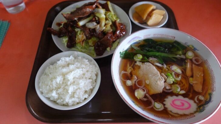ラーメン・レバー焼き・ライス・お新香がセットになった食いしん坊も万歳してしまうわんぱく定食です。