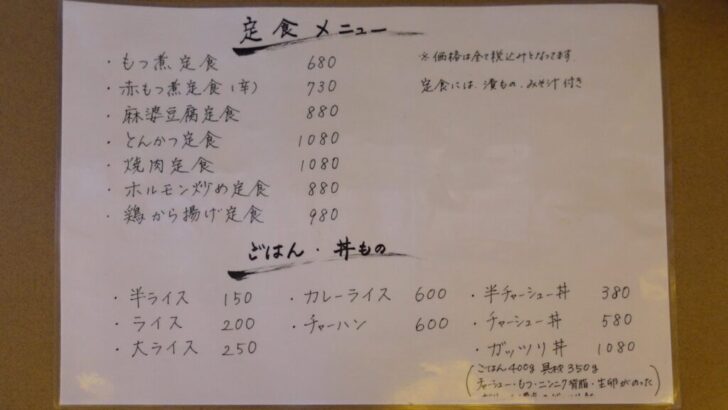 もつ煮定食にホルモン炒め定食、焼肉屋らしい定食が数種類あり、チャーハンやカレーライスまである。