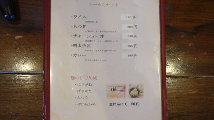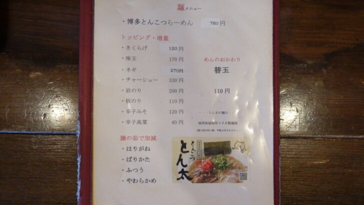 メインメニューは、博多とんこつラーメン1種類のみの男気溢れるメニュー構成です。