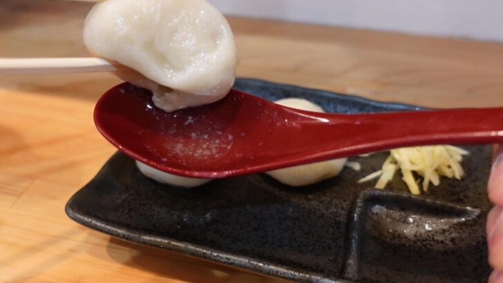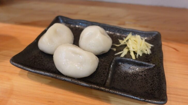 最初に注文したのは肉汁餃子、焼きと茹でを選択できる餃子で、ゆでをチョイスしました。
